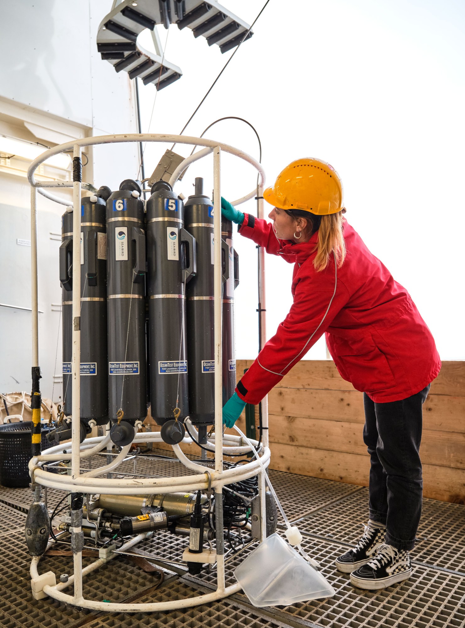Agathe Ollive, a geochemist from the Alfred Wegener Institute in Germany, takes water samples from a CTD rosette, an instrument package that measures conductivity (salinity) and temperature at various depths. She uses certain elements to trace the inflow of fresh water and seawater from rivers and adjacent ocean basins into the Arctic. “I didn’t expect there to be so little ice up here,” Ollive says. She is worried about how the Arctic will look 20 years from now.