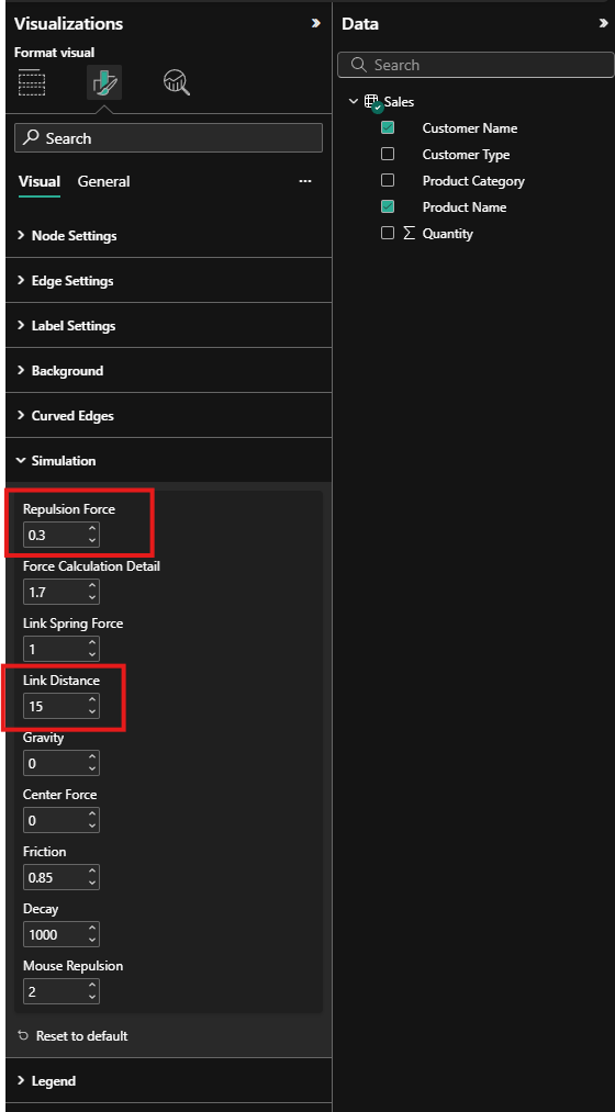 To change the simulation settings, open the formatting pane, then simulation, and increase both the link distance and repulsion force. I chose to set repulsion to 0.3, and link distance to 15.