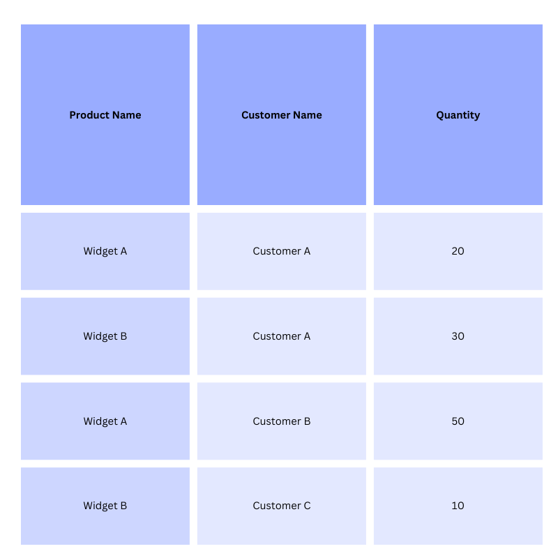 Let’s take a simple sales table as an example with columns for product name, customer name, and quantity.