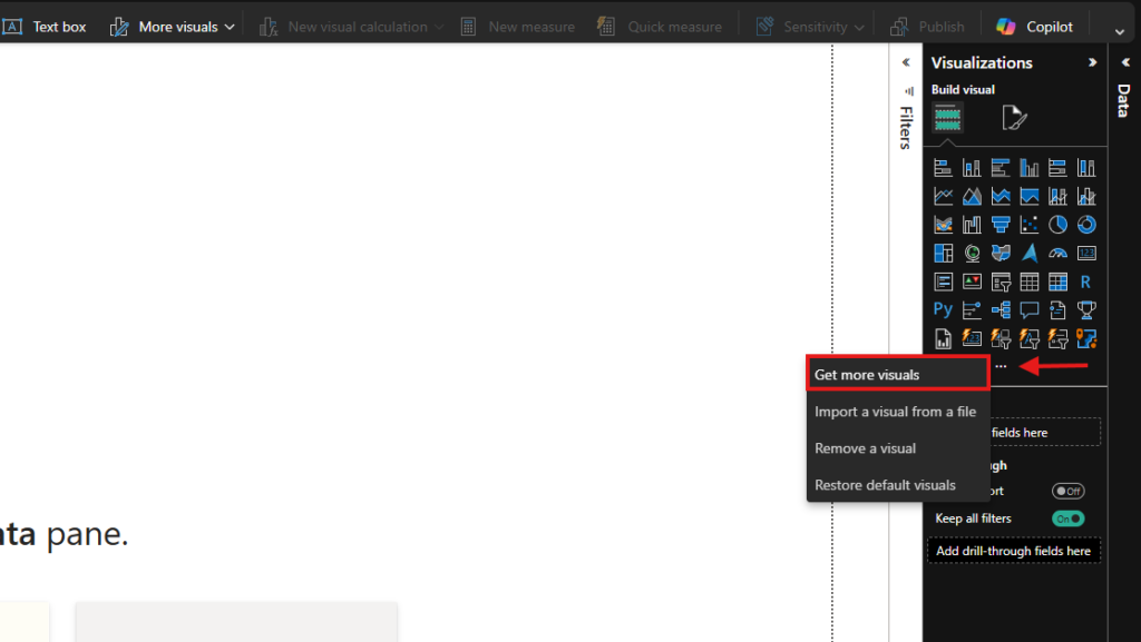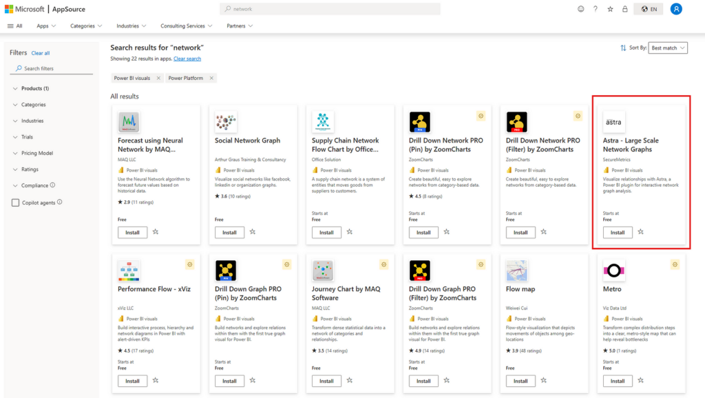 While Microsoft doesn’t include a network visual in the default PowerBI visuals, we can access the visual marketplace to download third-party visuals.