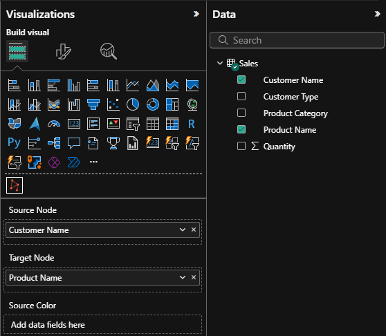 The only required values are “Source Node” and “Target Node” so let’s start there. Drag the columns you mapped to those nodes from the data pane.