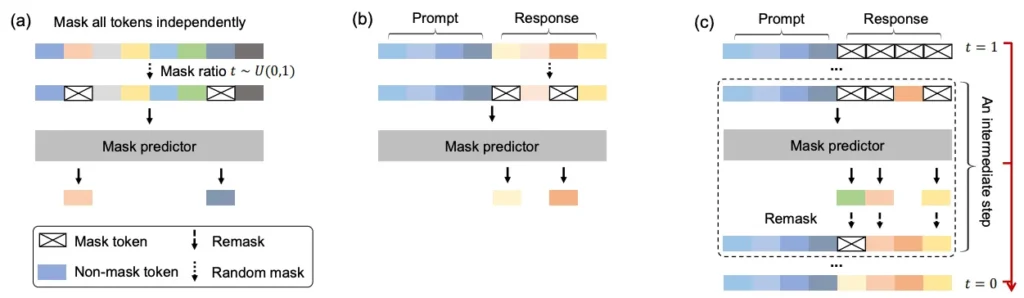 The image below summarizes the 3 steps described above. “Mask predictor” simply denotes the Llm (LLaDA), predicting masked tokens.