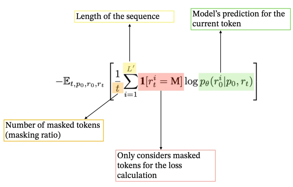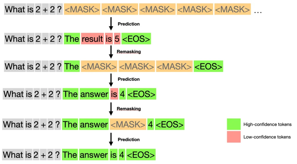 However, generating the full response at once during inference will likely produce very poor results because the model lacks information. Instead, we need a method to progressively refine predictions, and that’s where the key idea of ‘remasking’ comes in.