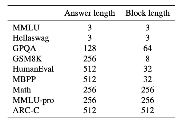 - Using different block and answer lengths for different tasks: for example, the block length is particularly large for the Math dataset, and the model demonstrates strong performance for this domain. This could suggest that mathematical reasoning may benefit more from the diffusion-based and backward process.