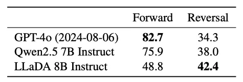 - Interestingly, LLaDA does better on the “Reversal poem completion task”. This task requires the model to complete a poem in reverse order, starting from the last lines and working backward. As expected, ARMs struggle due to their strict left-to-right generation process.