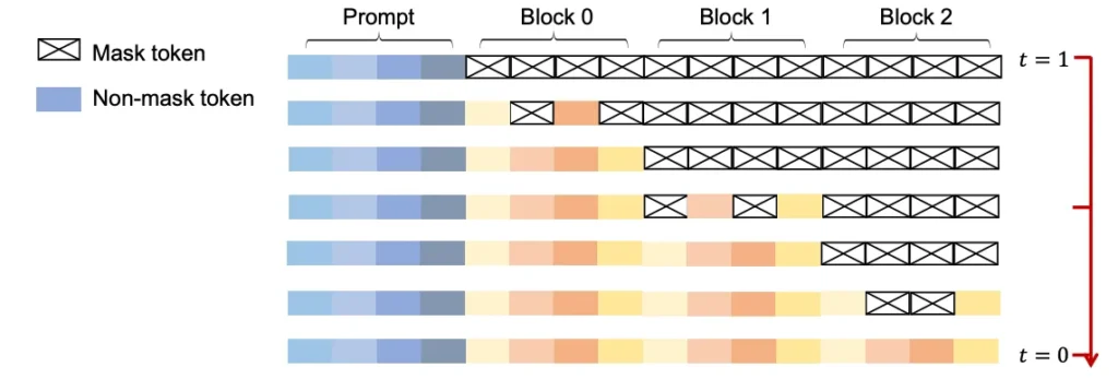 - For each block, we apply the diffusion logic by progressively unmasking tokens to reveal the entire block. Then move on to predicting the next block.
