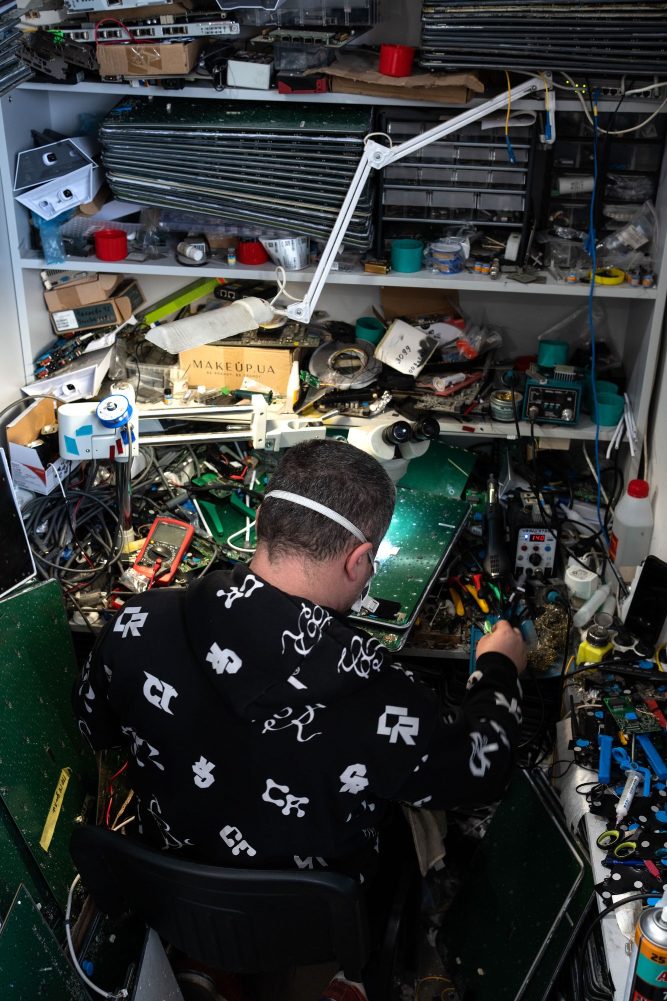 At least the situation seemed to have become better on the front over the winter, Kovalskyy added, handing me a Starlink antenna whose flat, white surface had been ripped open by shrapnel. When the fighting is at its worst, the team might receive 500 terminals to repair every month, and the crew lives in the workshop, sometimes even sleeping there. But at that moment in time, it was receiving only a couple of hundred.