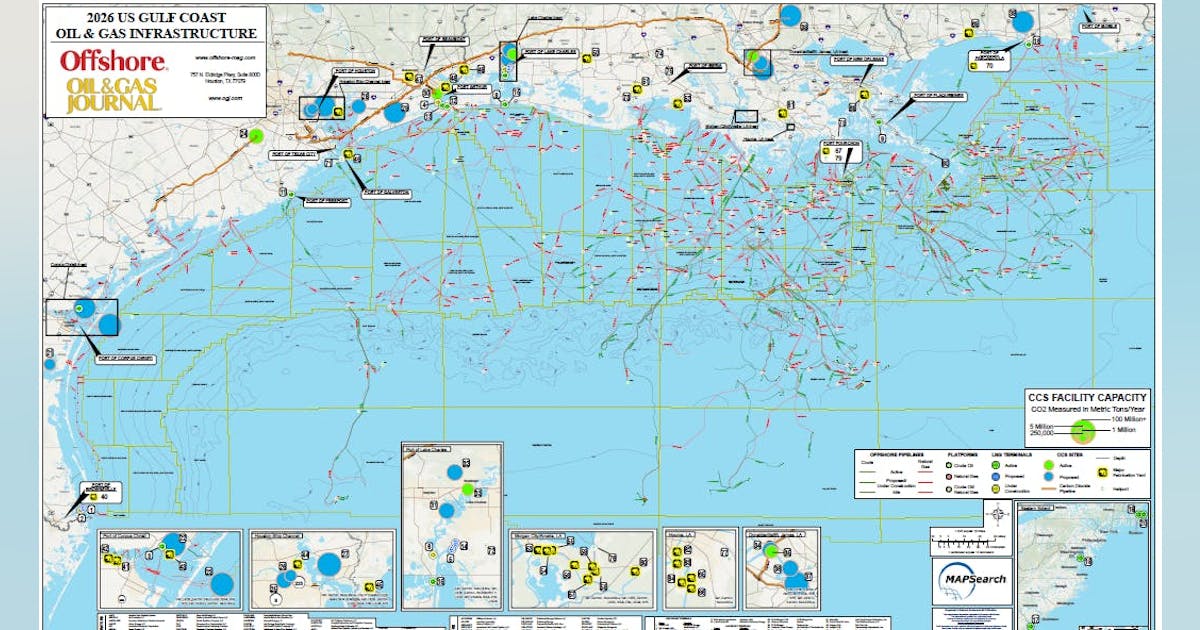 @import url(‘https://fonts.googleapis.com/css2?family=Inter:[email protected]&display=swap’); .ebm-page__main h1, .ebm-page__main h2, .ebm-page__main h3, .ebm-page__main h4, .ebm-page__main h5, .ebm-page__main h6 { font-family: Inter; } body { line-height: 150%; letter-spacing: 0.025em; } button, .ebm-button-wrapper { font-family: Inter; } .label-style { text-transform: uppercase; color: var(–color-grey); font-weight: 600; font-size: 0.75rem; } .caption-style { font-size: 0.75rem; opacity: .6; } #onetrust-pc-sdk [id*=btn-handler], #onetrust-pc-sdk [class*=btn-handler] { background-color: #c19a06 !important; border-color: #c19a06 !important; } #onetrust-policy a, #onetrust-pc-sdk a, #ot-pc-content a { color: #c19a06 !important; } #onetrust-consent-sdk #onetrust-pc-sdk .ot-active-menu { border-color: #c19a06 !important; } #onetrust-consent-sdk #onetrust-accept-btn-handler, #onetrust-banner-sdk #onetrust-reject-all-handler, #onetrust-consent-sdk #onetrust-pc-btn-handler.cookie-setting-link { background-color: #c19a06 !important; border-color: #c19a06 !important; } #onetrust-consent-sdk .onetrust-pc-btn-handler { color: #c19a06 !important; border-color: #c19a06 !important; } EndeavorB2B’s MAPSearch and the Offshore editorial team produced the 2026 US Gulf Coast Oil & Gas Infrastructure map for readers across the Offshore and Oil & Gas Journal brands, which serves as a useful resource for industry analysis, planning, and understanding of the Gulf Coast’s role in energy production and transportation. All of the following are included and can be identified in the legends in the bottom margin: Active, under construction and idle Gulf Coast natural gas and crude oil pipelines labeled by operator and diameter. Active offshore oil and gas platform locations. Active, under construction and proposed LNG plants numbered by names and operators. Active and proposed CCS project injection sites numbered by names and locations and labeled by CO2 capacity in metric tons/year. Active CO2 pipelines labeled by operator and diameter. Major fabrication yard numbered by names and locations. Major port names and locations. Major heliport numbered by names and locations. In addition, there is an inset for the LNG terminals on the East Coast as well as five for major hubs along the Gulf in Corpus Christi, Houston, Lake Charles, Morgan City/Amelia, Houma, and Donaldsville/St. James. Click the Download button below and click on the