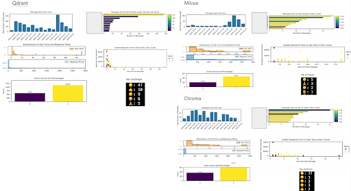 - User Engagement: Top users bar charts and scatterplots of response time vs. number of user turns show that, in general, more user turns mean higher satisfaction. But, satisfaction does NOT look correlated with response time. Scatterplot dark dots seem random with regard to y-axis (response time). Maybe users are not in production, their questions are not very urgent? Outliers exist, such as Qdrant and Chroma, which may have bot-driven anomalies.