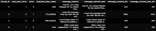 The first step was to convert the data into a pandas data frame. Below is an excerpt. You can see for thread_id=2, a user only asked 1 question. But for thread_id=3, a user asked 4 different questions in the same thread (other 2 questions at farther down timestamps, not shown below).