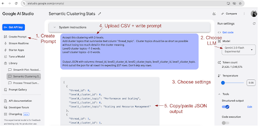 - Prompt Perplexity Pro or Gemini 2.0 Pro for clustering based on thread summaries using the same CSV.
