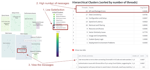 I found this very insightful. For Chroma, clustering revealed that while users were happy with topics like Query, Distance, and Performance, they were unhappy about areas such as Data, Client, and Deployment.